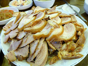 チョッパルの専門店。店頭にある豚肉をカットして出してくれます。この盛りは2人前で量が多いです。でも、韓国の人普通に女性も食べていました。