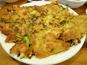 釜山の国際市場の近くにあるチジミの店です。海鮮チジミは周りがサクッとしていて中にはイカやエビがたくさん入りW12000でした。いつも夜は満員なので昼間きて正解♪