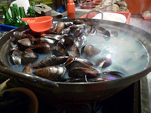 釜山駅前の大きな交差点を渡りまっすぐ行った左側に出ている屋台です。主に貝類を扱っていて、ムール貝の煮たやつをいただきました。スープは呑みすぎた時に効きそうです♪