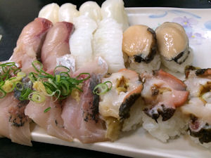 <天神橋5丁目:まるまん寿司> カウンターに座り、注文は紙に書いて手渡す仕組み。ネタも市場から直送というだけあって新鮮。活車海老の握りは、ずっとシッポが動いてました。また牡蠣も臭みがなくとても美味しかったです。 時間 :11:00~22:00 TEL :06-6358-0226 |