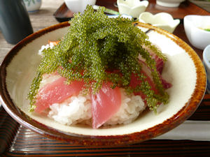 橋を渡り右折すると民宿も兼ねた食堂があります。ウニ丼がすでに完売で海鮮丼をいただきました。海ブドウたっぷりです。