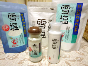 宮古島で作られる雪塩を使ったシリ-ズです。塩は料理はもちろん、溶かしてミネラル水にしてもOK。用途は色々です。