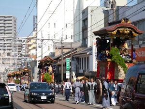 電車が通る大通りを行きます。ここが全ての曳山が並ぶ一番のシャッターポイントですね。