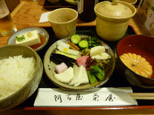 <清水:阿古屋茶屋> 二年坂の途中にある、京漬物のバイキングの店。みそ汁と冷奴が付き、漬物は20種類位用意されています。ご飯は白飯と十六穀米、お粥の三種類で1280円です。白飯とお粥2種類食べちゃいました。 時間 :11:00~16:30 TEL :075-531-0056 |