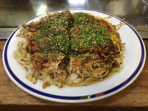 お好み焼き村入っているお店で一品料理が多いためちょい呑みにも良さそう。お好み焼きの麺はソースで味付けされ、やや大きめにカットされたキャベツも甘みがあって美味しかったです。