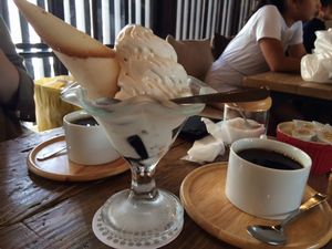 酒蔵通りにある珈琲店です。喫茶スペースは2Fにあり、落ち着いた空間になっています。珈琲とコーヒーゼリーパフェを注文。パフェに乗っているのアイスはとても濃厚なバニラソフトです。