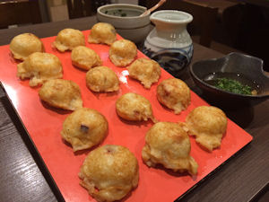 表面はカリッとして中はふわふわ&とろとろの玉子焼です。熱々の出汁に三つ葉を入れて玉子焼を浸して食べます。備え付けのソースを塗るとたこ焼きみたいです。私はやっぱり出汁がいいかな♪