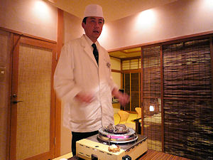 | 夕食は【磯の舞踏会膳】です。あわびは料理長が自ら部屋まで焼きに来てくれます。見とれて食事の手がとまる人が多いとか。朝食はここからどうぞ。 |