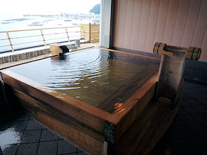 | プランを利用すれば入浴することが出きる展望風呂です。古代ヒノキで作られたお風呂で、目の前は海。最高ですね^^ |