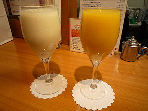 大丸神戸店のB1Fにあり、新鮮なフルーツや野菜を使ったフレッシュジュースがいただけます。写真はバナナジュースと季節もののマンゴーオレンジジュースです。