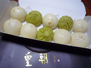二口サイズの肉まんとあんまんのセットです。1個90円で肉まんは肉汁たっぷり、あんまんは甘すぎない餡で皮はほんのり抹茶風味です。