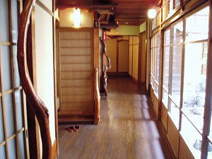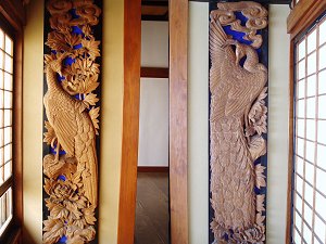 障子にはデザインが施されていて、この部屋は富士?が描かれていました。各部屋ごとに造りがちょっとづつ違っていて趣があります。天井画のある部屋は、そのものをある場所に提供してしまったため見ることは出来ません。