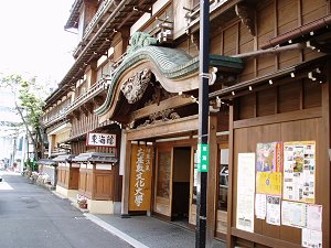 R135で「伊東駅入り口」から下田に向かって4つ目の信号を右折、川沿いに唐破風の玄関を持つ東海館があります。タオルはフロントで販売しています。