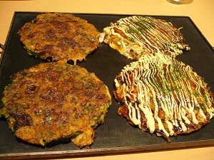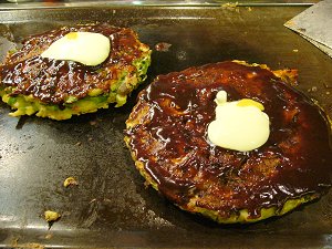 モダン焼きは太目の麺が入った広島焼き風で右側はスジ肉が入ったお好み焼きです。