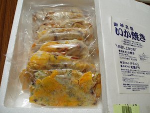 大阪以外ではあまり知られていない"いか焼き”は、味がつけられた小麦粉の生地の中に、だしに漬け込まれたいかと青ねぎを入れて焼き上げられたもので、薄味が中に入った具の味を引き立てていて美味しいです。お歳暮の時期には冷凍したものを発送してもらえます。