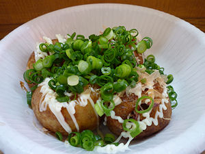 外はかりっとしていて中はとろっとしたたこ焼き。素焼きと甘口ソースの食べ比べをしました。たこも柔らかくて美味しいです。