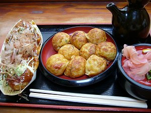 なんばグランド化月の隣にある、たこ焼き道場。たこ焼きは卵が多めで中がトロっとして個人的には一押し。店内でゆっくり食べることもできます。写真はたこ焼きと、出汁につけて食べる、わんこたこ焼き。