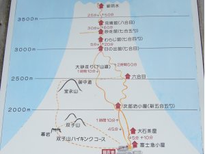 富士登山する上での、山小屋の位置とその距離、およその時間などが表示されています。