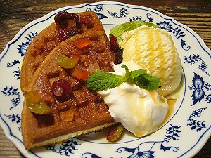 <堀:吹風山の珈琲館> レストランも併設している喫茶店。豆の種類はないけれど豆のひき方や保存方法にこだわって美味しい珈琲をいれてくれます。写真はデザートセットのワッフル。季節によって異なります。食事の 北欧鍋コース は後ろ側のレストランで。 時間 :12:00~23:00 tel :0773-22-1875 定休日 :月曜日(定休日が祝日の場合は振替) |