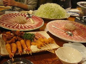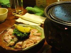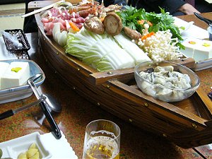 <内記:紀文> 鍋が主流のお店。写真は逆写しですが、「紀文鍋」で魚介類やお肉など豊富な具材が船盛にされています。他にも三田牛を使った牛すきもあります。鍋は1人4000円~6000円くらいです。 時間 :18:00? tel :0773-22-6688 |