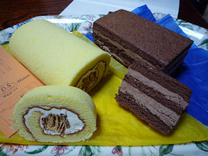 自然な甘みで、甘さが後を引かない美味しいケーキです。ブルージュショコラはベルギーチョコをたっぷり使ったケーキ。ロールケーキには栗とパイが入っています。人気店になった「エスコヤマ」の師匠のケーキ屋さんです。