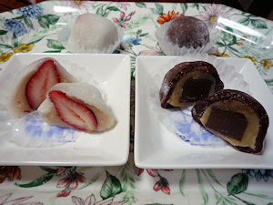 長岡天神のそばにある和菓子屋さんです。柔らかい求肥に包まれた白餡といちごの大福。そして生チョコが入った大福。甘さ抑え目で美味しいです。