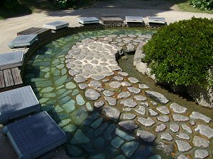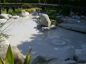 一塩化物泉 泥の中からぼこぼこと地熱で沸騰しているような感じです。ちょうどその様子が海坊主が頭をだしているのに似ているとか。何箇所かあり、ここが一番大きいところ。99.3℃あります。 沸騰している様子が見にくいのでマウスをあわせてね。 |