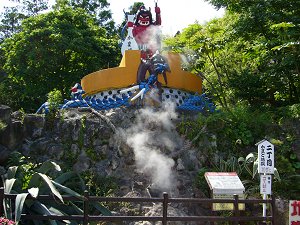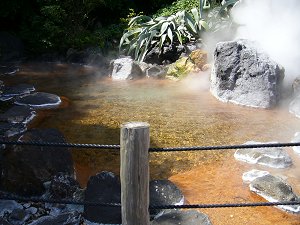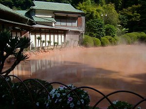 ◆血の池地獄 :酸性緑礬泉 温度は78℃。化学反応を起こした赤い熱泥が地層から噴出したものだそうです。風向きが追い風の時、タバコの煙を真下の池に向かって思いっきり吹きかけてみてください。不思議にも化学反応で湯気が走って行きます。見にくいですがマウスをあわせてね。 |