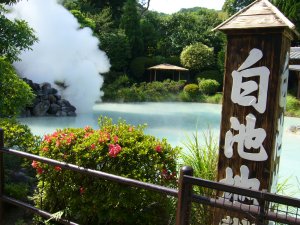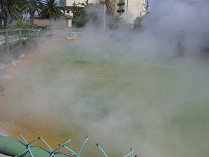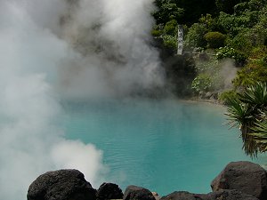 ◆白池地獄 :含ホウ酸食塩泉塩化ナトリウム、ケイ酸、重炭酸カルシウム含む 噴出する熱湯は無色透明ですが、池に落ちると化学反応を起こし青白く色が変化するそうです。 |