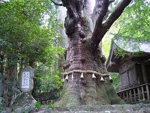 「大杵社」の大杉は樹齢千年の大木です。大木の裏側には穴が開いていて、その昔子供がいたづらして火事を起こした跡だとか。その煙で殺菌され、中が空洞になってしまったのが幸いして長く生きていられるんだそうです。