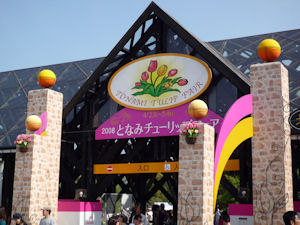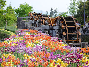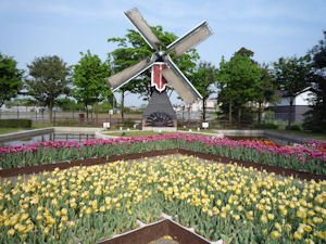 オランダの水車と一緒に。結構こじんまりしています。そばには名産品やチューリップの販売、軽食などの販売がされています。