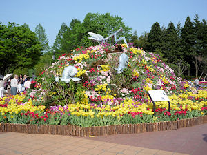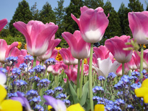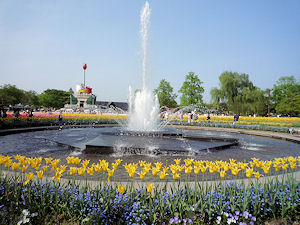 噴水の周りにも色とりどりのチューリップがいっぱいです。