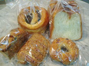 富士山の溶岩で作った石窯で焼きあげるパンは表面がカリッとしたもの。大納言ブレッドはバター風味のフワッとした生地に甘くて柔らかい小豆がたっぷり入り特にお勧め(左)。マウスを合わせると別のパンが・・^^