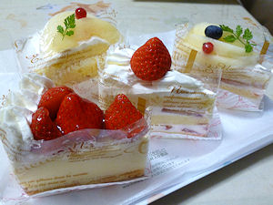 旬のフルーツを使ったケーキが並びます。ケーキは甘さ控えめのあっさり系です。冬は苺、夏はメロン・桃でした。マウスをあわせてね。