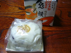 <キヨスク:大江 鬼饅頭> 饅頭の大きさは10cm!敷き紙の上に直接あんこをポンと乗せて皮を被せたような饅頭で、とにかく迫力満点。 |
