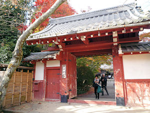 赤い山門は「吉野門」とも呼ばれていて、吉野太夫が寄贈したもの。38歳で亡くなり、墓も境内にまつられています。