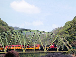 川の上に掛かる橋を渡るトロッコ電車です。