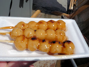 終点が近くなると売店の船が来ます。そこで買ったみたらしだんごです。