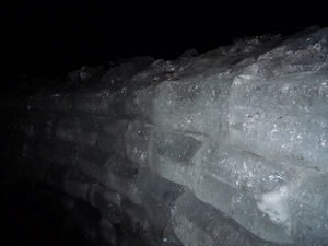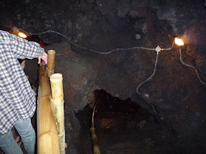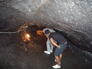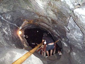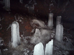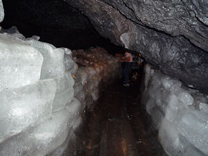 洞内の温度は真夏でも0℃です。氷穴は階段が多く、通路の高さも低いので座った状態で進む場所もあります。 |