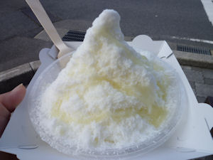 散策しながら「雪花の郷」という、かき氷屋さんで一休み。ミルク味の氷をかき氷にしてあり、色々なシロップが選べます。ふわっとした雪解けのような口当たりです。 |