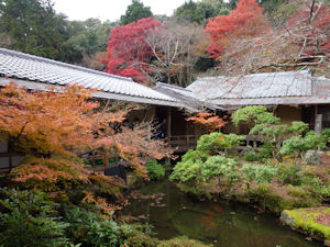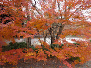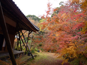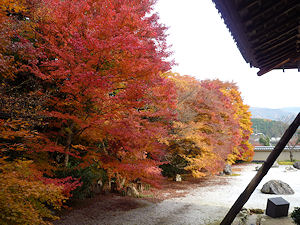 左の建物の開き戸の部分が床紅葉や床緑が映しこまれる部屋です。天気のいい午後が一番綺麗だそうです。残念ながら堂内は撮影禁止でしたが、黒光りした床に移りこむ赤は必見です。