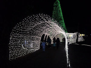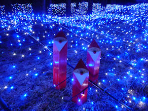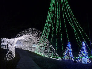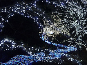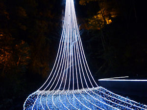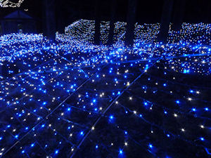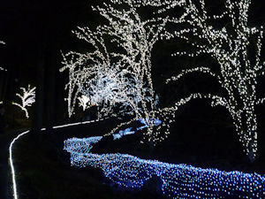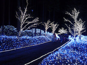 駐車場から遊歩道までは地域の方で作られたLEDが歓迎 1/2からどうぞ。琴滝までの遊歩道入り口はトンネルでお出迎え。 |
