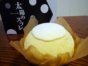 阪急百貨店で販売していて、焼きあがりの時間には列ができる「太陽のスフレ」はチーズスフレでふわっとした触感としっとりした触感がミックスされた感じでとろっとしたチーズがかかっています。