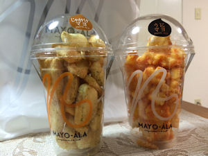 阪急デパート限定のマヨネーズベースで作られたおかきです。いろいろな種類があって迷いますが、人気はウニマヨだそうです。袋詰めにされたものは日持ちがしますが、カップ詰めされたものは1週間の賞味期限だそうです。