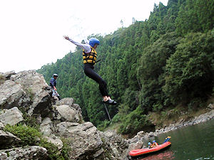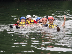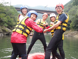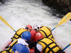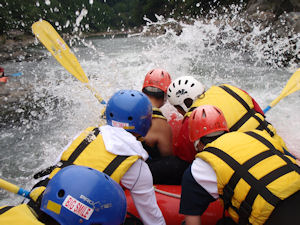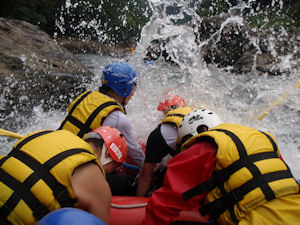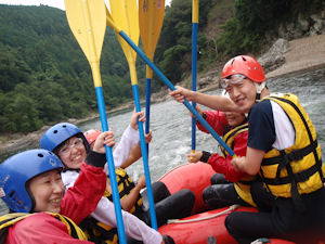 出発前に説明を受けてからボートに乗り、インストラクターの指示のもとオールを使います。激流ポイントでは波しぶきを頭から被りますよ~。