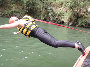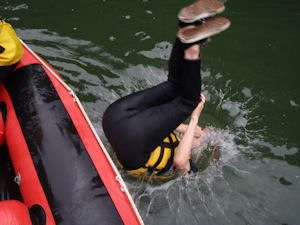左右分かれて思いっきりボートを揺らす遊びをしたあと、タイタニックのように手を広げてどこまで傾斜姿勢を保てるかという遊びです。もちろん、そのまま水面に落ちるのは決まりごとですね?